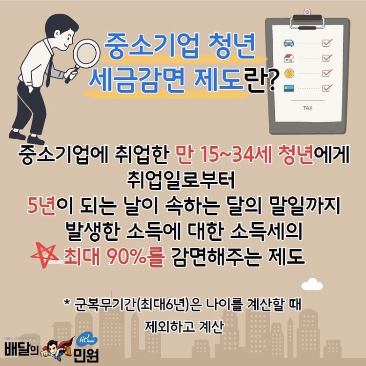중소기업에 다니는 만 15~34세 청년들은 5년간 90%의 소득세가 감면된다고해요 (최대 150만원)